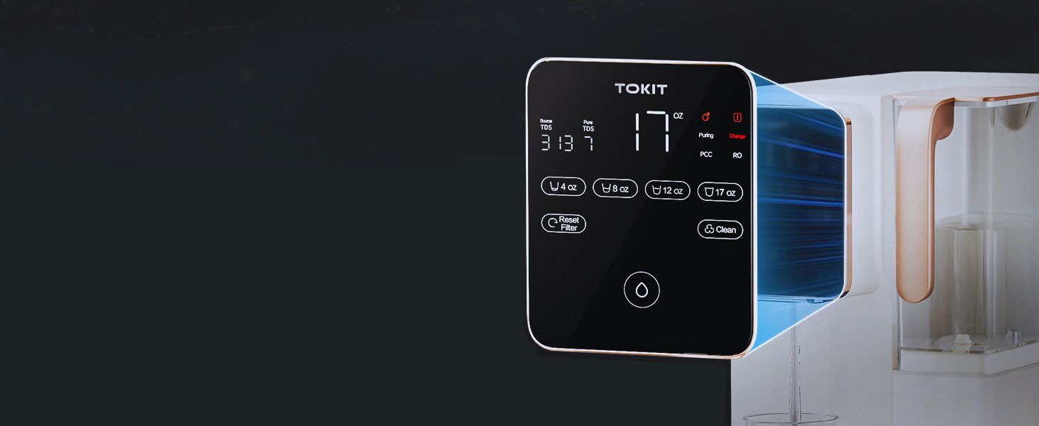 The smart panel allows easy operation and real-time monitoring of TDS values for visualizing water quality, featuring a low water reminder and offers 4 water volume options (4OZ, 8OZ,12OZ,17OZ).